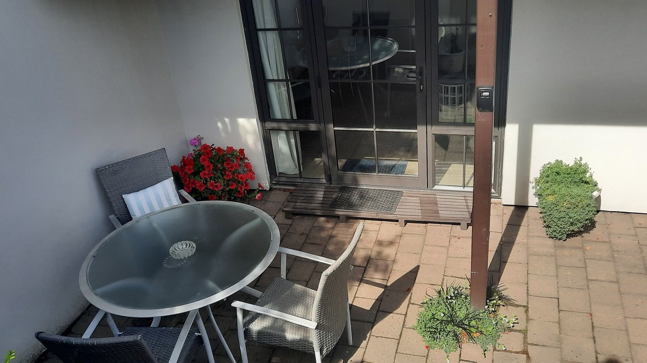 Private courtyard surrounded by mountain ranges and a view of Coronet Peak Ski field in the quaint town of Historic Arrowtown.