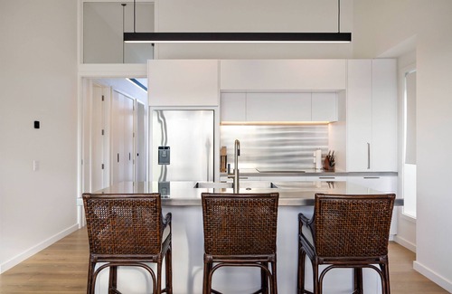 Clad in corrugated corten steel and warm timber, the exterior pays homage to the historic cabins once scattered across the Cardrona Valley. But step inside, and you’ll discover a home that’s anything but rustic. The Soho unfolds into a spacious, open-plan living, dining, and kitchen area, where clean lines and contemporary finishes meet comfort and functionality.